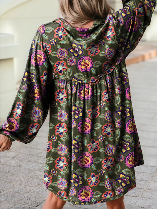 Floral Print Split Neck Long Sleeve Shift Mini Dress
