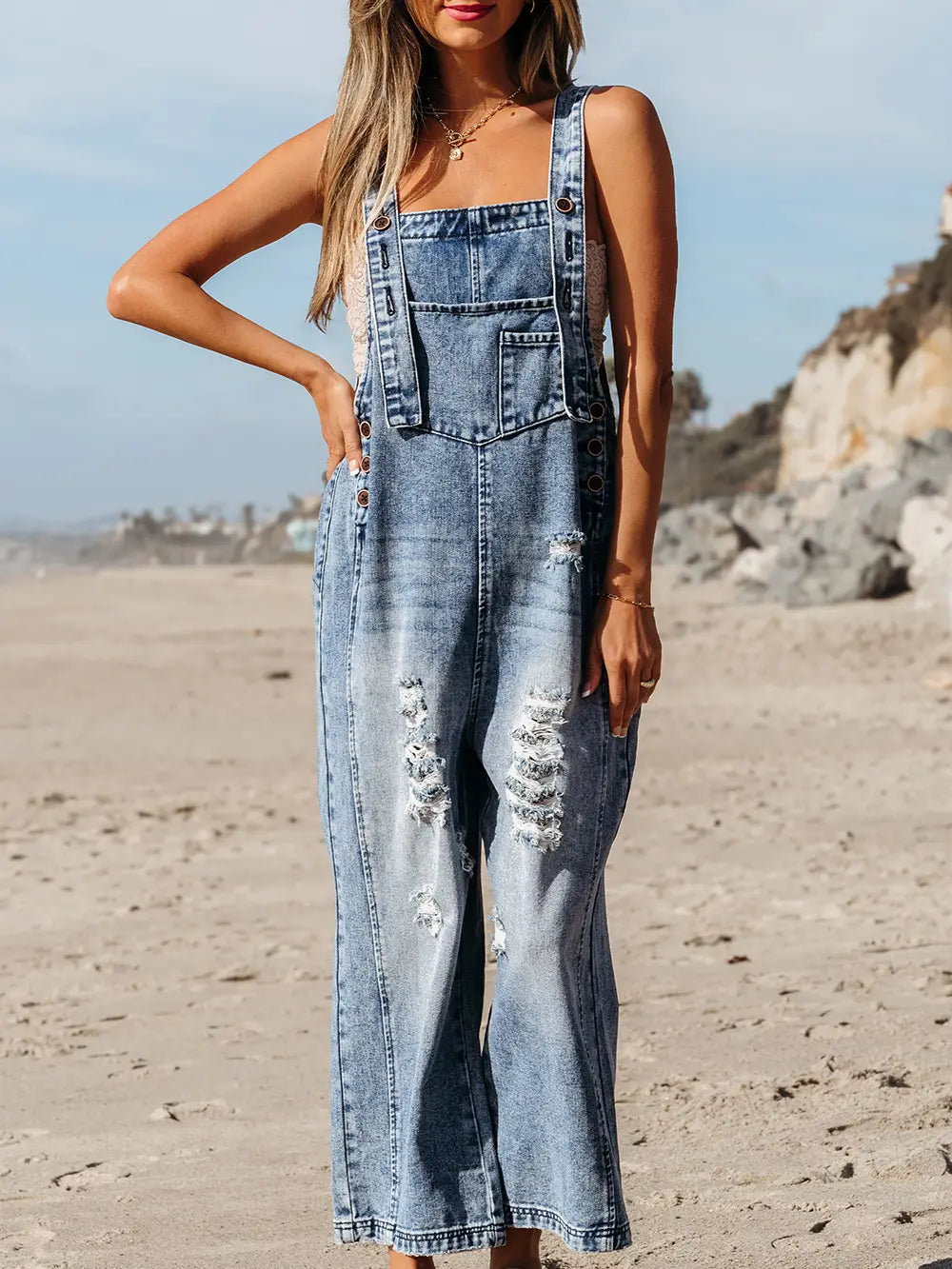 Crafted in a stylish stone blue blend of 75% cotton and 25% polyester, this Distressed Pocketed Wide Leg Capri Denim Overall offers a perfect balance of comfort and durability. Meticulously designed with distressed detailing and functional pockets, it combines fashion-forward appeal with practical wearability. The wide leg and cropped length provide a relaxed yet polished silhouette, ideal for a chic casual look with expert-level style.